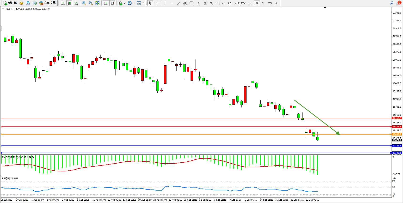 香港恒生指数9月23日(周五)收盘下跌214.68点,跌幅1.18%,报17933.27点;加息潮令金融市场表现低迷,港股再度下挫,恒指跌1.18%下破18000点且继续刷新调整低价,恒生科技指数跌2.29%,失守3600点亦创阶段低价。大型科技股跌势不止令大市承压,欧盟放松对俄罗斯煤炭的限制,煤炭板块大跌居前,南下资金逆势净流入35.95亿港元,大市成交额为808亿港元。