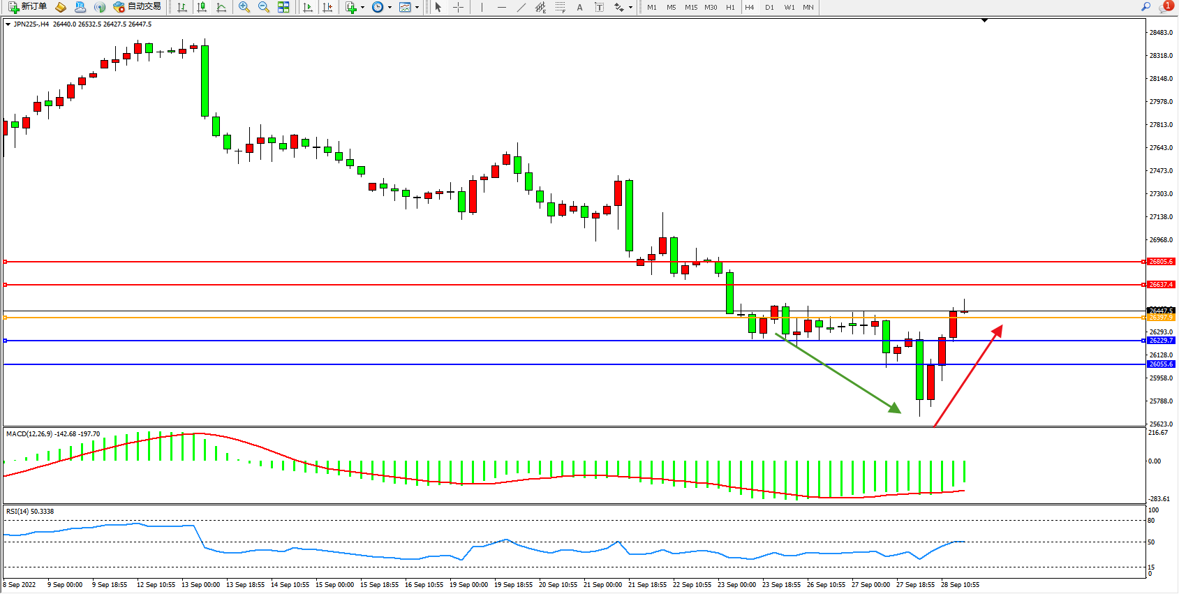 4小时图看:空头动力维持震荡下行,低位短期V型反转拉升,多头开始伺机入场,MACD指标处于空头区域维持震荡上行,RSI指标处于50均衡线附近弱势徘徊;
