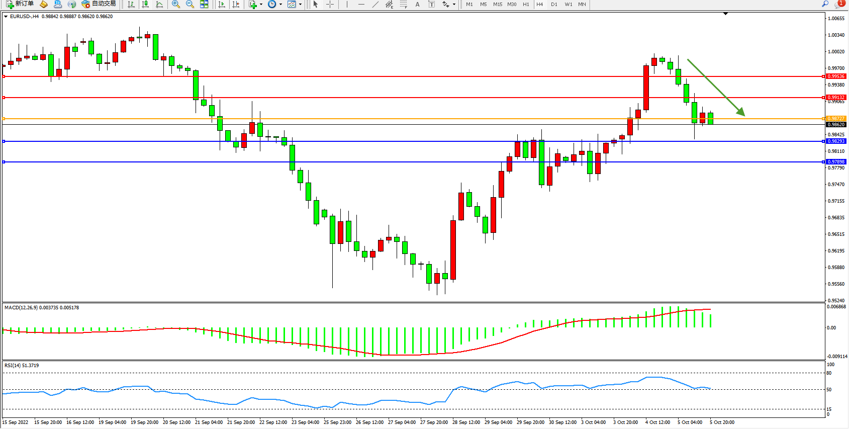 欧元美元EURUSD—4小时K线图显示: