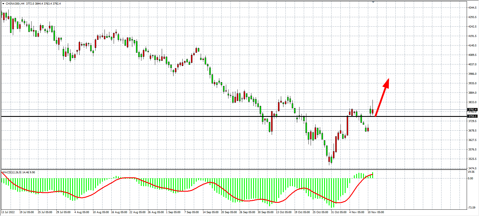 1小时图看,沪深300突破3710后涨势加速,同时MACD量能在零轴之上重新放量,显示行情有进一步上行动力,当前支撑已上移至3755,日内在该位之上继续以看涨为主,目标上看3870-3950