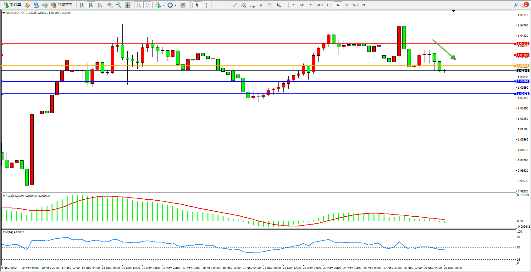 欧元美元EURUSD—4小时K线图显示:
