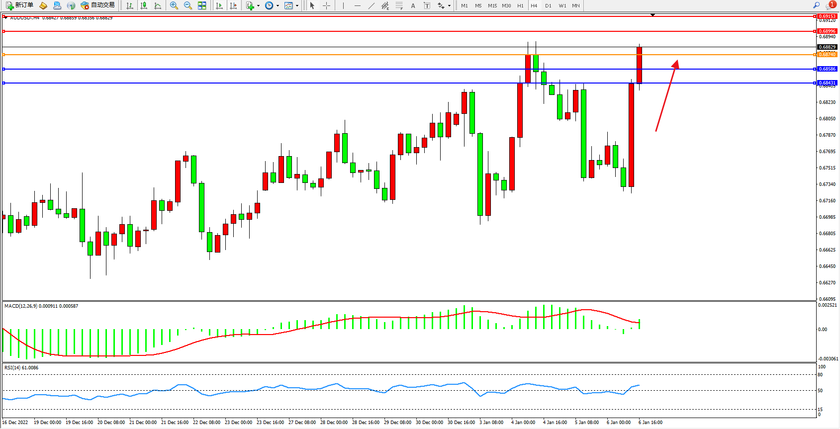 交易策略:0.68740上方看涨,目标0.68996、0.69153