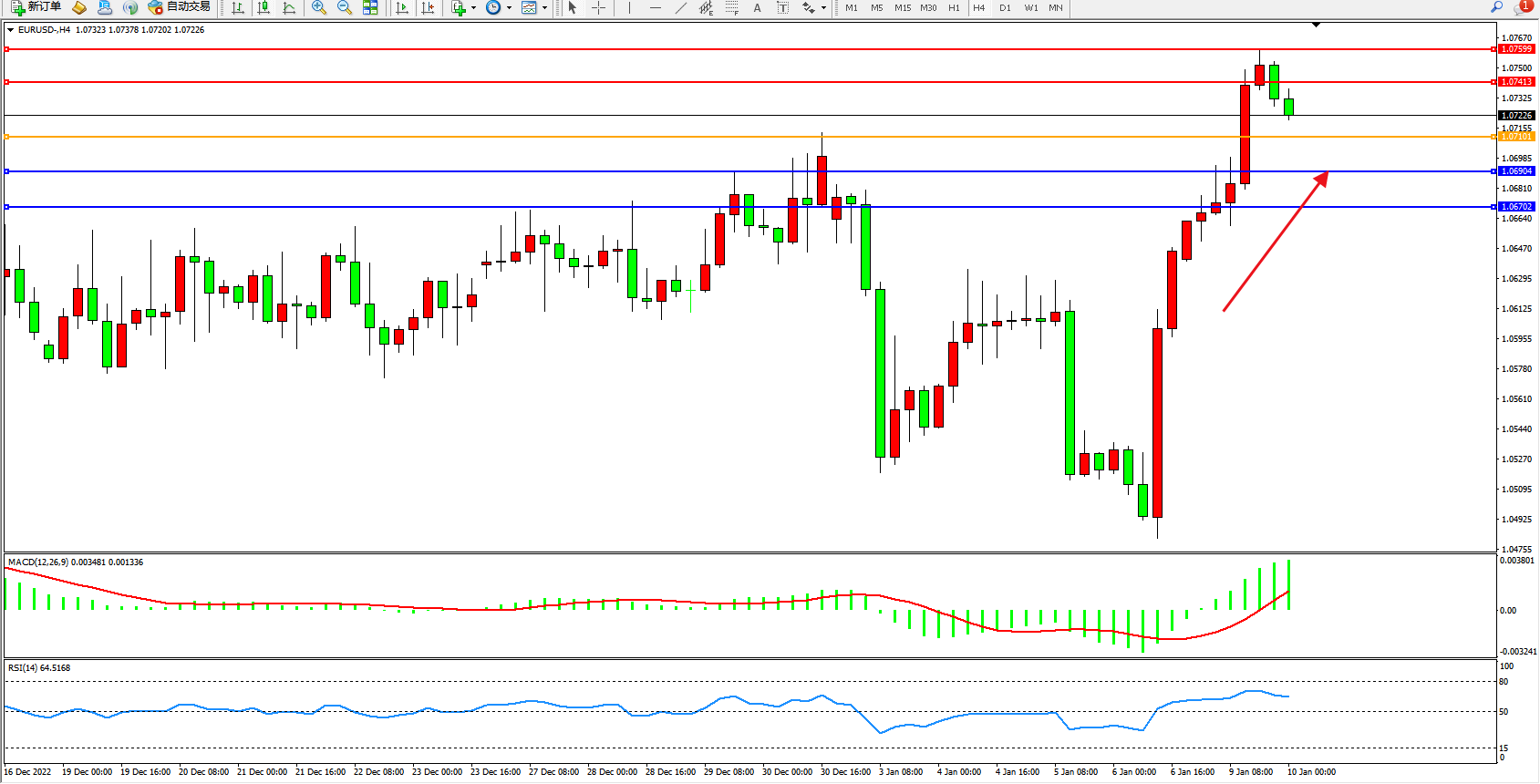 欧元美元EURUSD—4小时K线图显示: