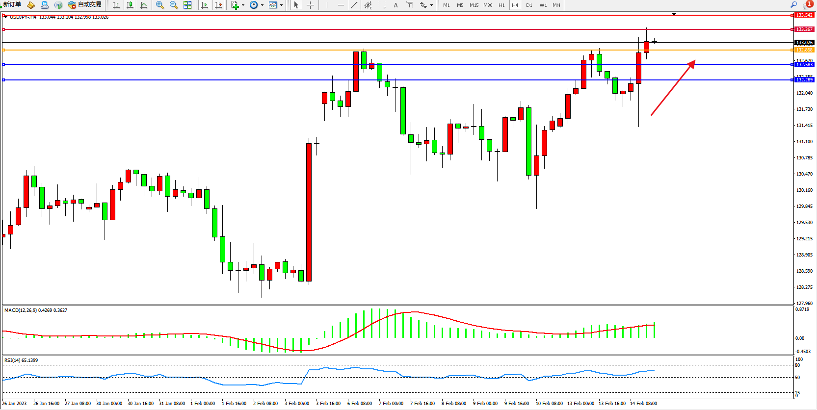 交易策略:132.868上方看涨,目标133.267、133.542