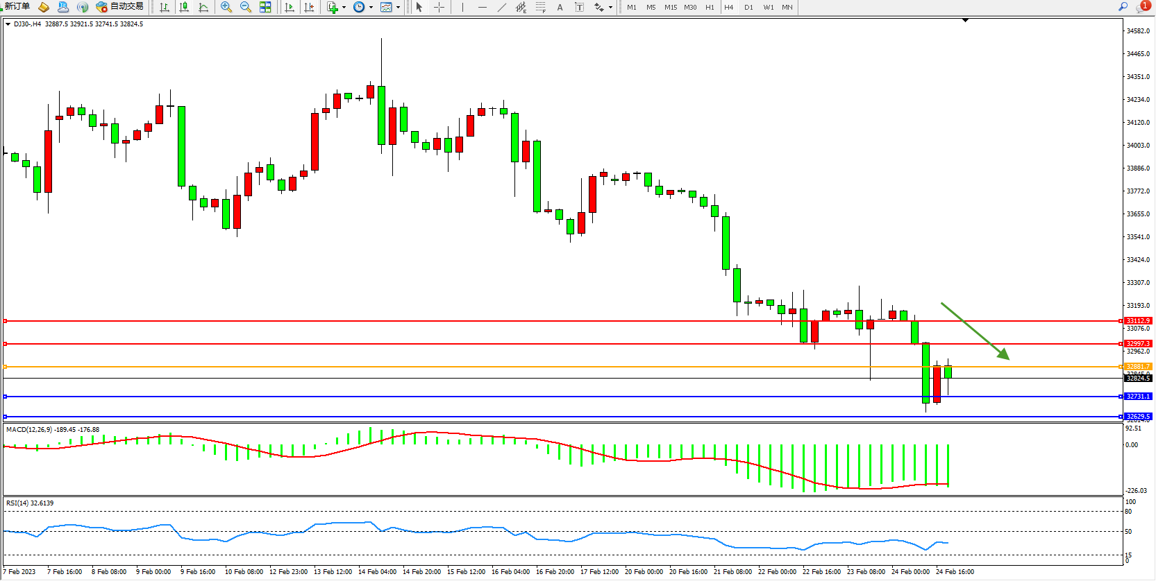 道琼斯指数2月24日(周五)收盘下跌336.86点,跌幅1.02%,报32817.05点;美国1月消费者支出大幅反弹,收入增长强劲,同时通胀加速,这可能加剧金融市场对美联储可能在整个夏季继续加息的担忧。