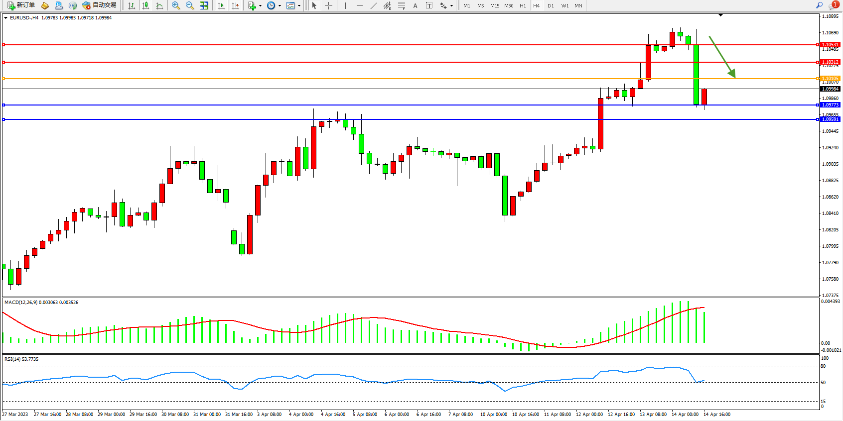 欧元美元EURUSD—4小时K线图显示: