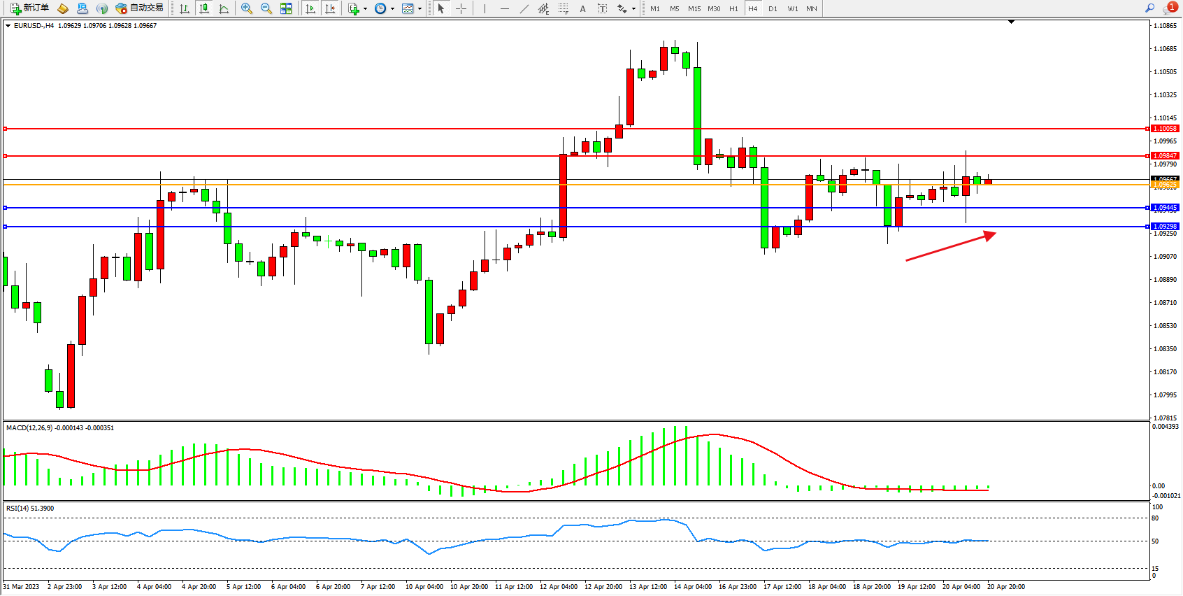 欧元美元EURUSD—4小时K线图显示:
