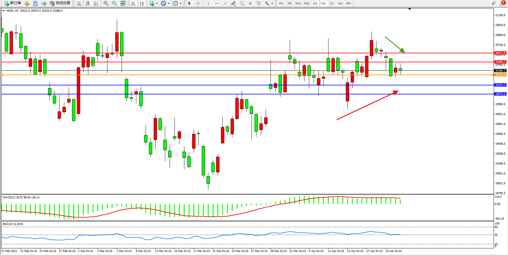4小时图看:高位空头动力窄幅回撤,市场多头趋势依旧,短期整理后有继续向上移动迹象,MACD指标处于0轴线上側徘徊,RSI指标处于50均衡线附近弱势徘徊;