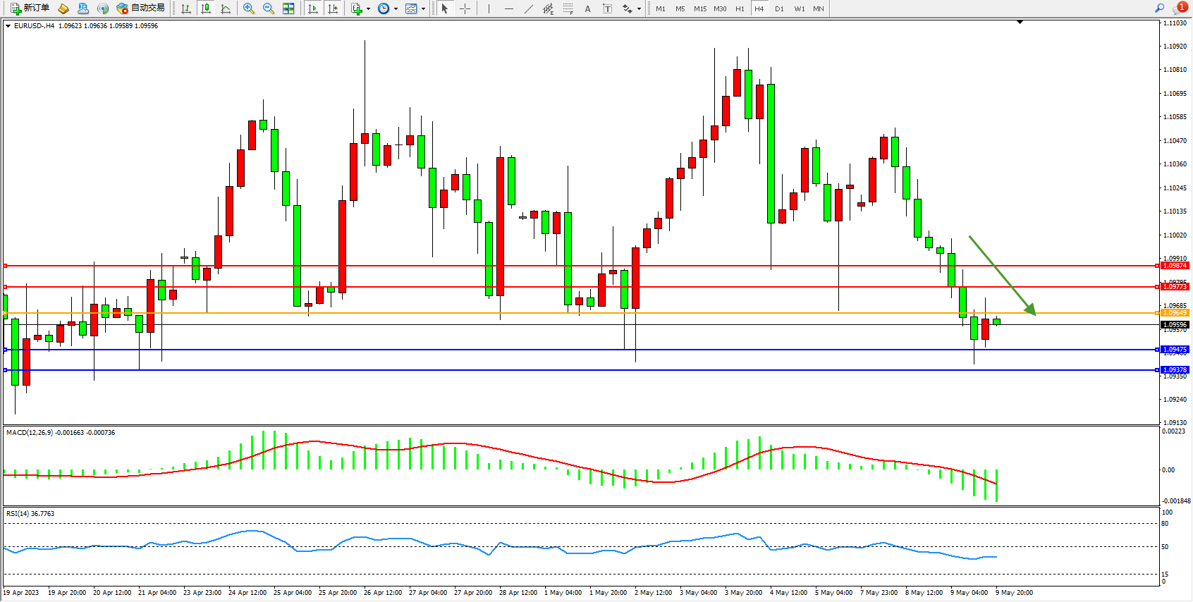 欧元美元EURUSD—4小时K线图显示: