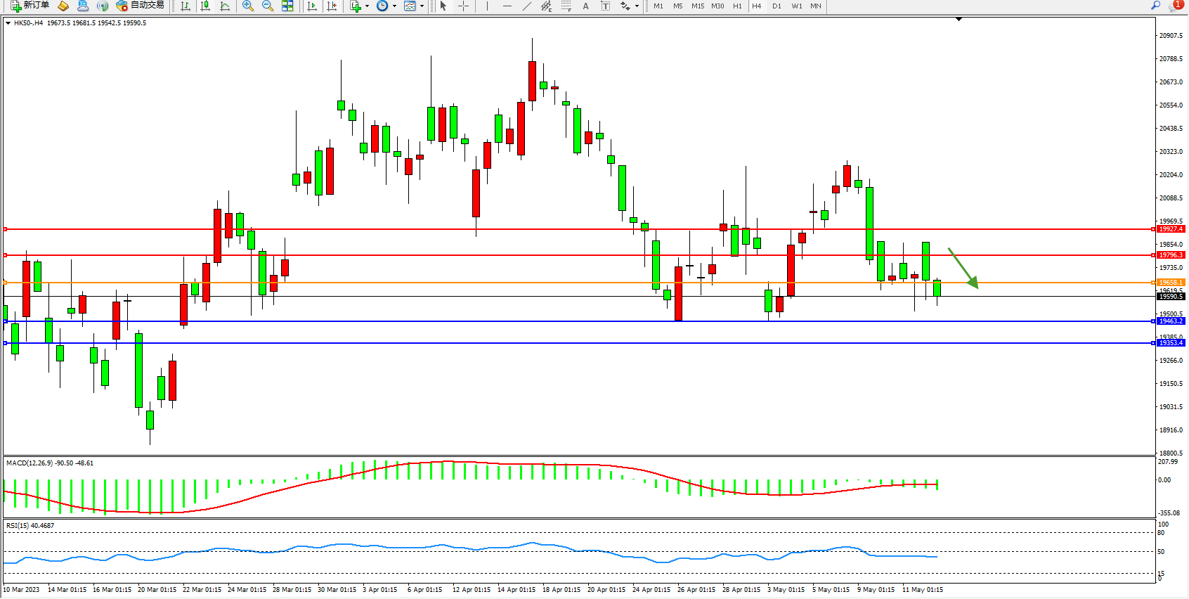 香港恒生指数5月12日(周五)收盘下跌116.55点,跌幅0.59%,报19627.24点;港股恒指、国指午后跌幅明显扩大,最终分别下跌0.59%和0.47%,恒生科技指数涨幅收窄至0.29%,早盘一度涨1.8%。前期强势的大金融股、中特估概念股集体低迷拖累大市走弱。香港第一季度GDP季率5.3%,预期5.30%,前值5.30%,年率2.7%,预期2.70%,前值2.70%。南下资金全日净流入8.76亿港元,大市成交额为1027亿港元。
