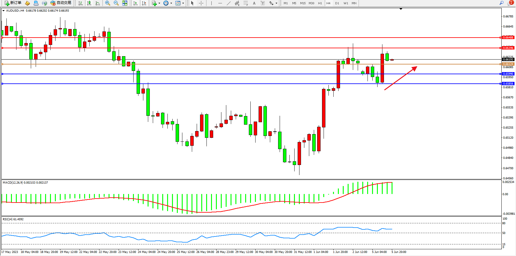 交易策略:0.66124上方看涨,目标0.66346  0.66488