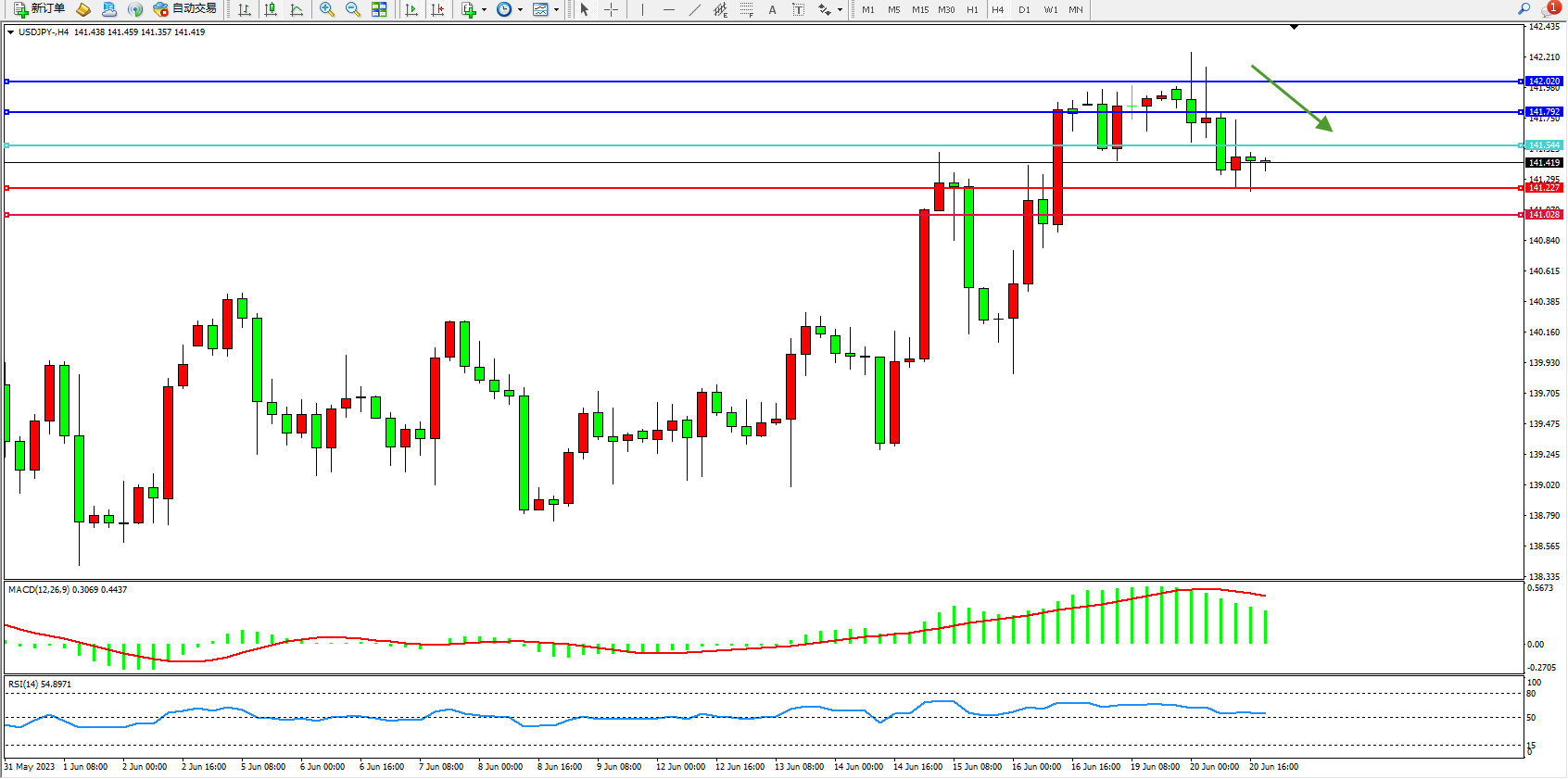 交易策略:141.544下方看跌,目标141.227 141.028