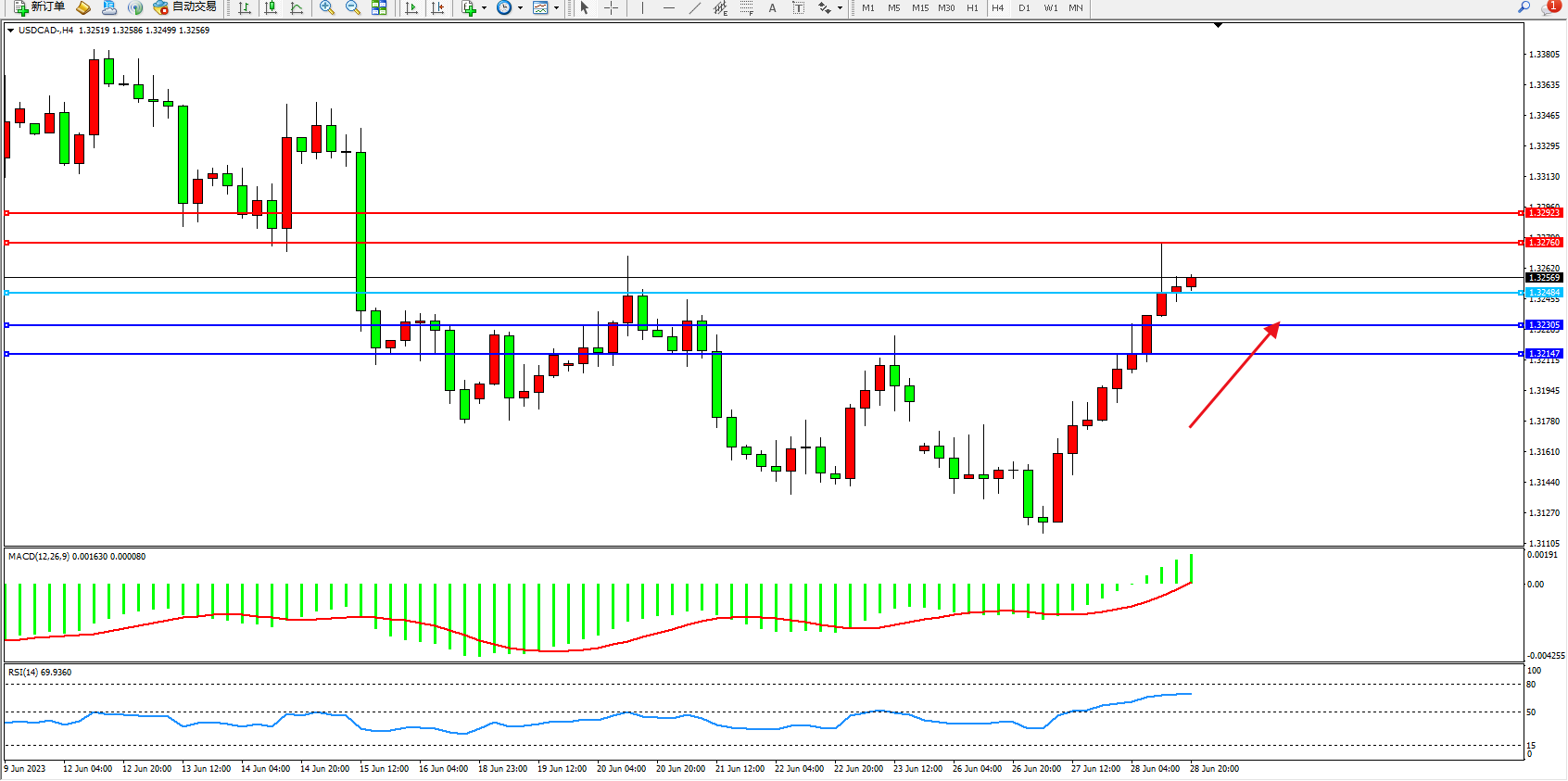 4小时图看:多头动力强势上扬,短期有继续向上移动态势,市场多头不断拉升中,MACD指标处于多头区域高位上移,RSI指标处于多头区域持续上行;