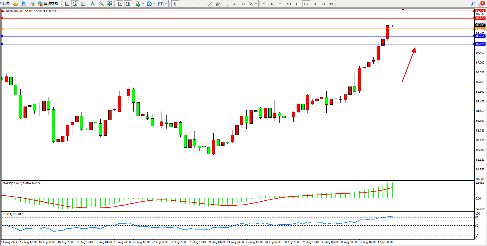 布油维持88.793附近震荡,在沙特的领导下,高效的生产国产量限制将为价格上涨创造条件,这将使布油价格超过今年的高点89.09美元/桶,上升到第四季度的平均预测价格93美元/桶,季度内可能会超过100美元/桶。