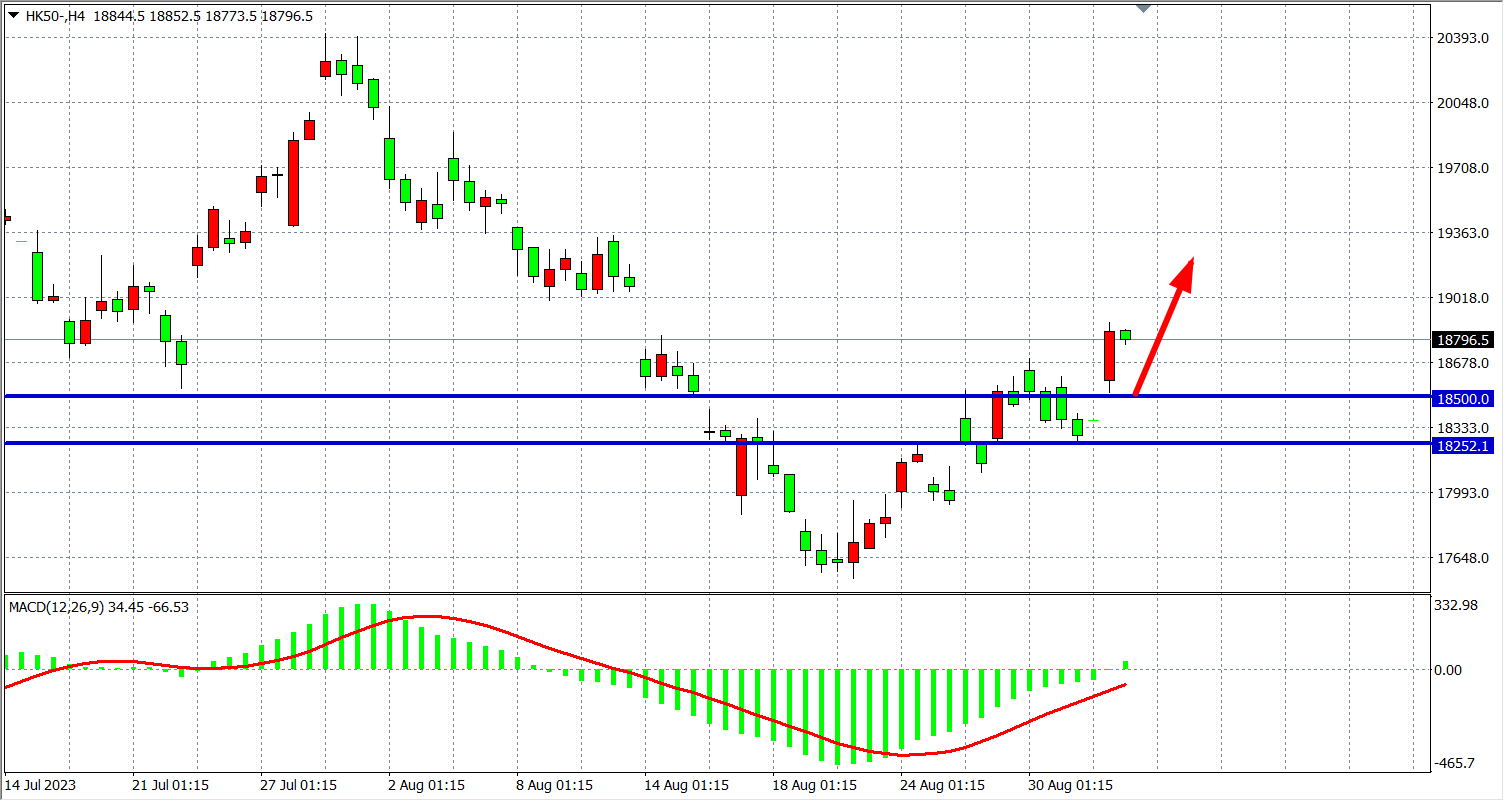 4小时图看,恒指重新走强上攻,MACD量能上穿零轴之上,支撑关注182500-18250附近,阻力关注19000-19350附近。