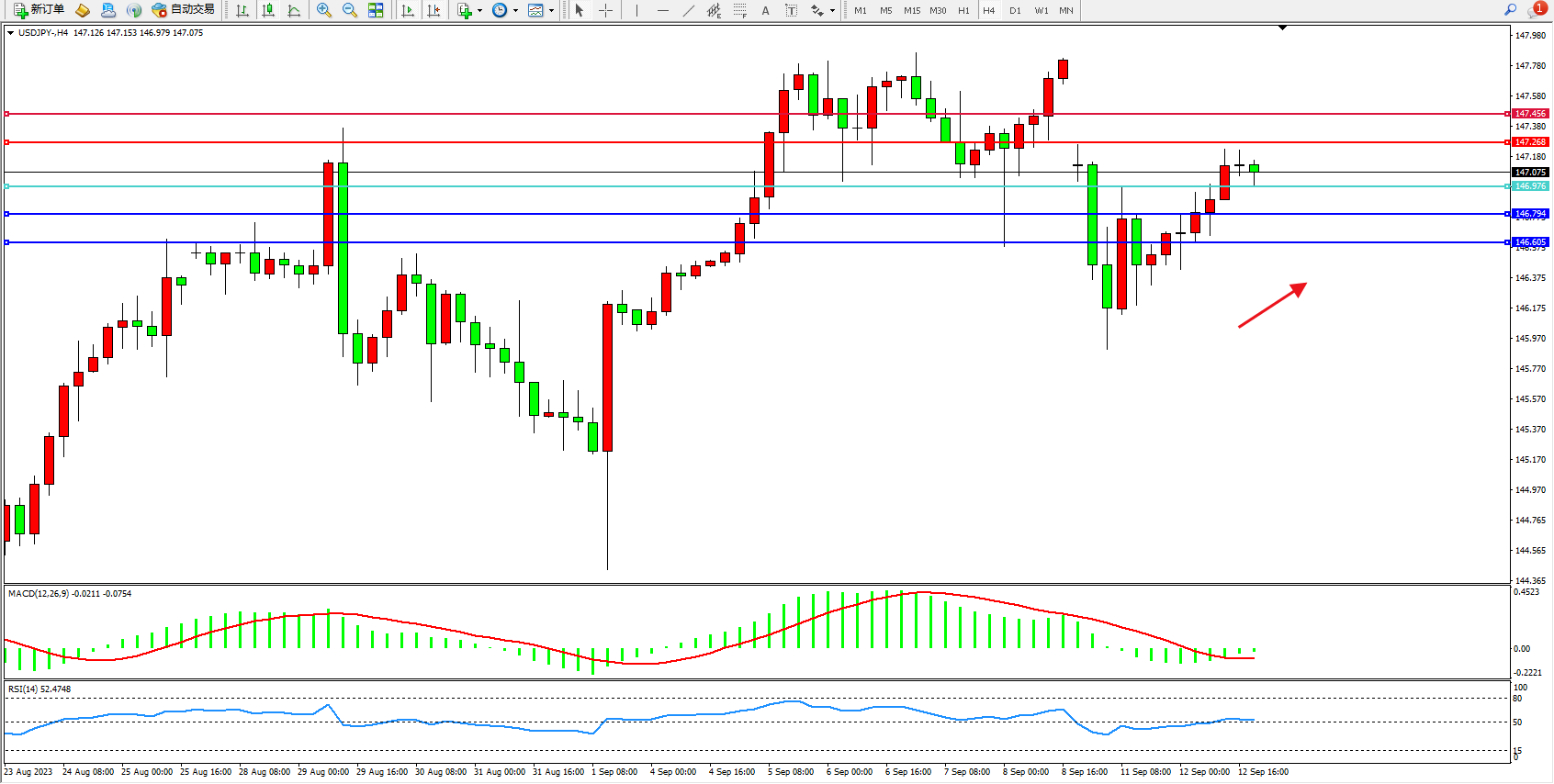 交易策略:146.976上方看涨,目标147.268  147.456