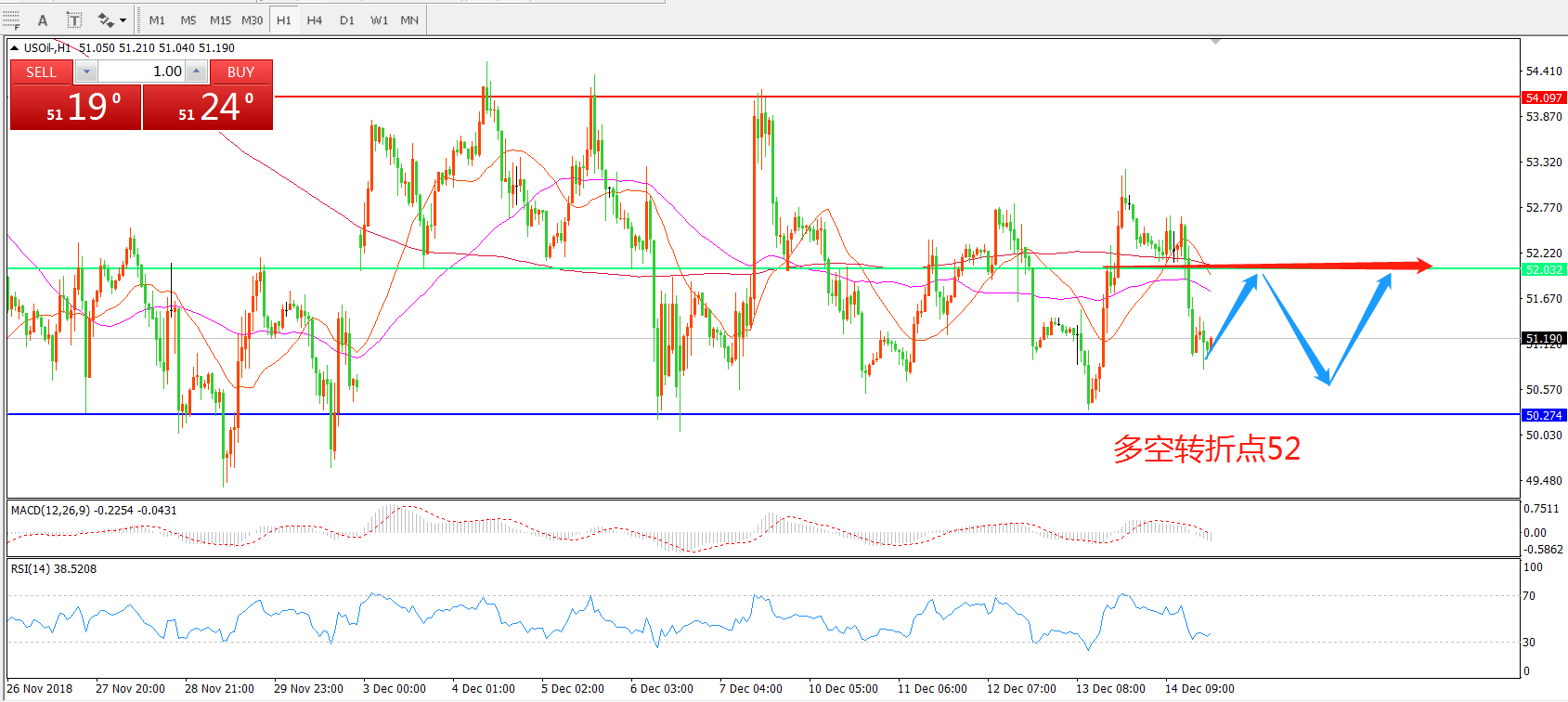 小时图看,油价冲高回落,目前整体价位位于均线系统之下,52美元的多空转折点依旧有效,MACD,绿柱增加,日内预计以50-52美元区间震荡走势为主。