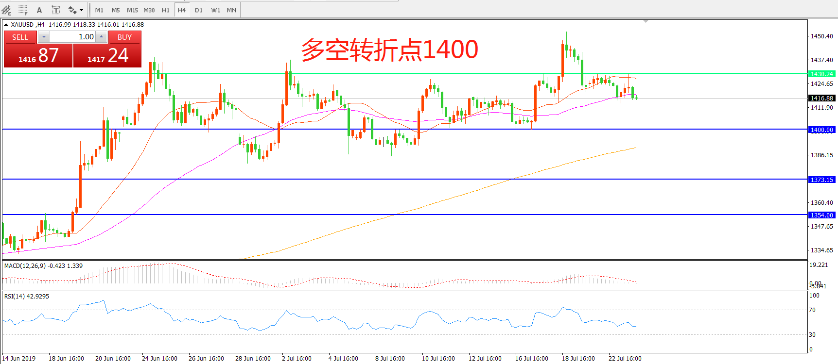 4小时图看,金价整体呈现震荡形态, 1430成为短期阻力,金价冲高回落后显示多头动能不足,MACD红柱缩短,RSI指标走平,震荡下行成为可能,但中期走势仍然偏多。