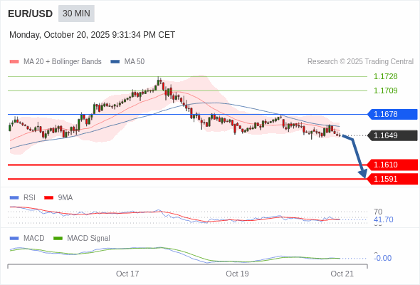 欧元/美元 当日内 : 看跌,在 1.1678 之下。