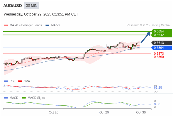 澳元/美元 当日内 : 看涨,当 0.6594 为支撑位。