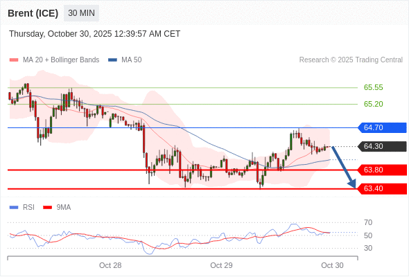 在 64.70 之下,看跌,目标价位为 63.80 ,然后为 63.40 。