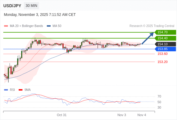 在 153.85 之上,看涨,目标价位为 154.40 ,然后为 154.70 。
