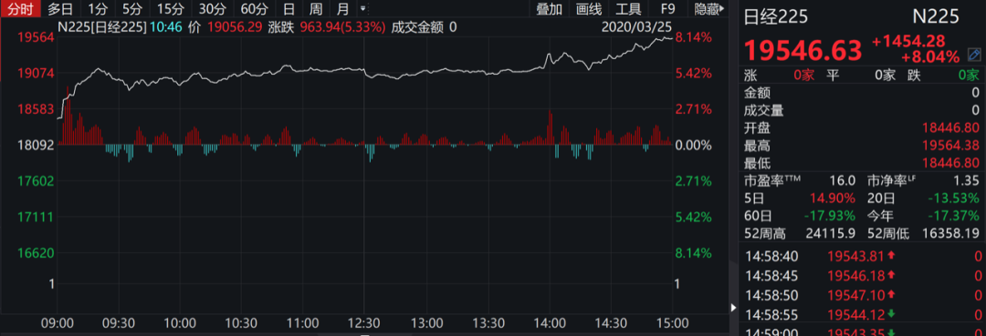 日经225指数收盘涨8.04%,报19546.63点,创2008年11月来最大升幅。据日经新闻报道,日本政府考虑制定规模超过56万亿日元的财政刺激计划,其中包括向受疫情冲击的家庭发放现金。日本内阁最早将在4月批准补充预算,最早在5月开始向家庭派发现金。
