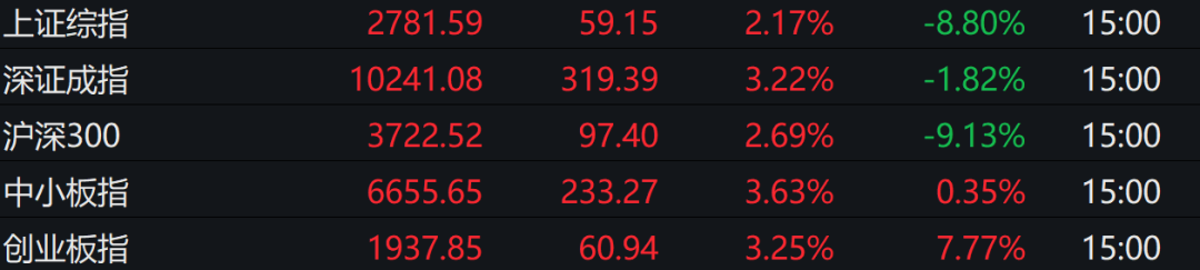 其中沪指涨超2%站上10日线,创业板指涨逾3%,深成指涨超3%,截至收盘,沪指涨2.17%报2781点,深成指涨3.22%报10241点,创业板指涨3.25%报1937点。