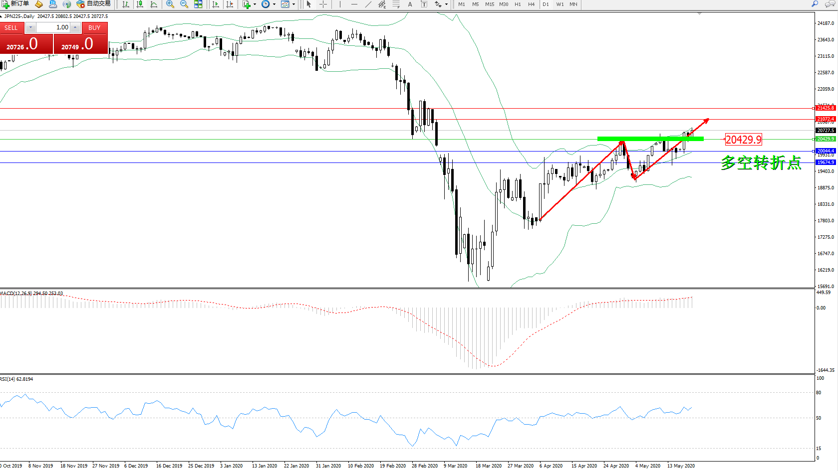 日经225指数520日(周三)收盘上涨165.55点,涨幅0.81%,报20599.00点。日本3月核心机械订单下滑,表明新冠疫情对经济的冲击不断扩大,尽管大量高价商品订单缓解了下滑速度。3月订单小幅下降可能导致本季投资崩跌,4月国内机械工具订单重挫,说明上个月核心机械订单大幅下滑;日本工具机械工业会(MTBA)上周发布的初步预估显示,日本4月机械工具订单降至逾10年来最低水平。5月日本企业信心下滑态势加剧,降至十年来的最低点,因为企业为新冠病毒疫情导致的长期经济疲软做好准备。日本央行将于周五召开紧急政策会议,将为金融机构设立一套奖励机制,以鼓励他们向受到新冠疫情打击的小企业增加放贷;投资者需要予以关注。