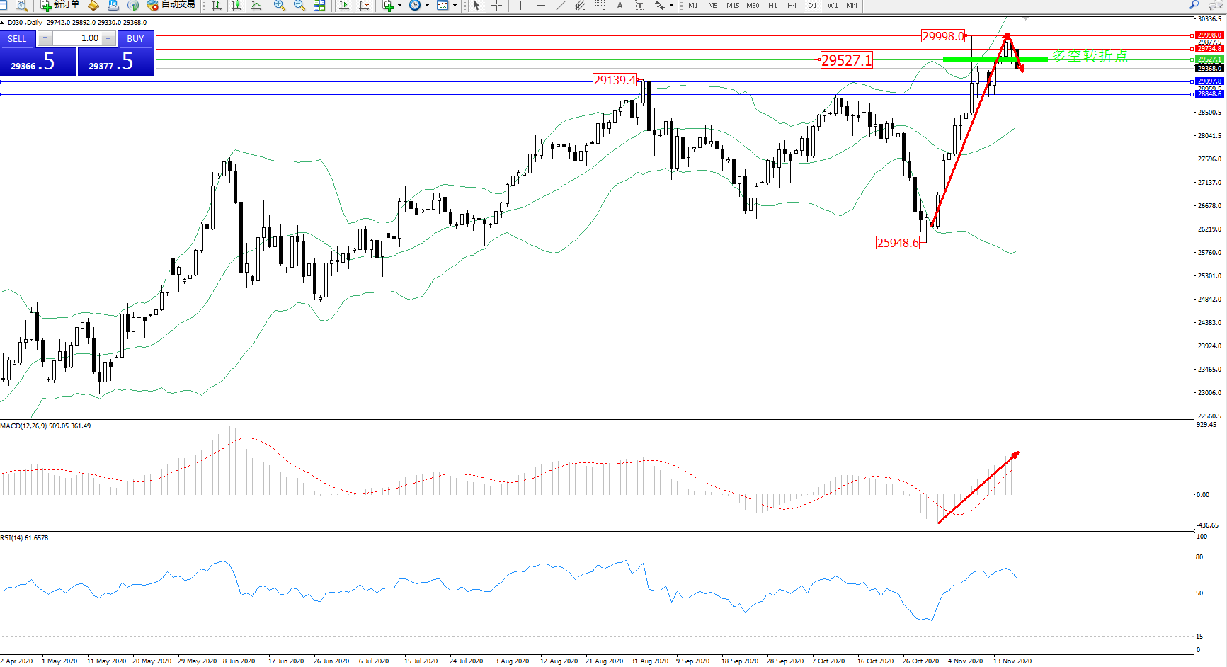 技术点评:低位多头动力强势拉升上扬至29998附近后遇阻开始震荡,高位出现短暂回撤走势,布林带指标呈张口走势后开始有收口迹象,MADC指标处于多头区域持续震荡上移后开始持续走平,RSI指标处于多头区域维持整理平移后有回撤下移迹象;