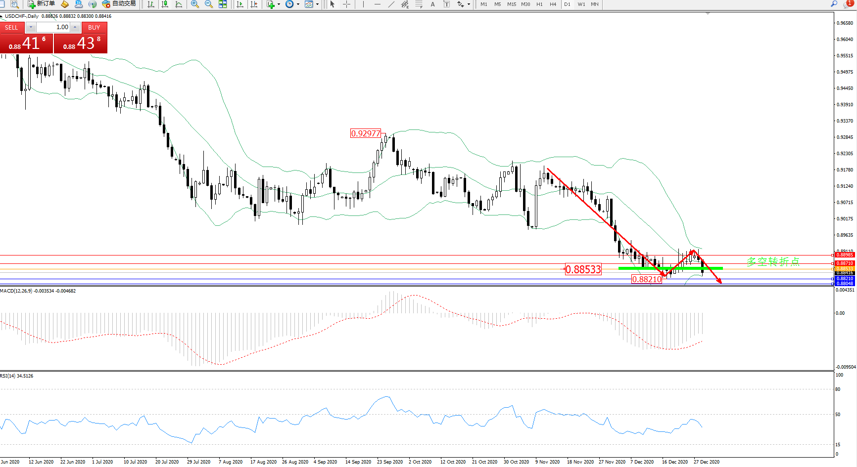 技术点评:空头动力延续布林带指标通道中下轨区间持续震荡下移后,处于底部窄幅震荡平移中,前期低位0.88210位置近在咫尺,破位在即,布林带指标通道呈收口走势后有张口迹象,空头动力持续向下跌势依旧,MACD指标处于空头区域底部维持整理后有向上移动,RSI指标处于空头区域底部维持震荡向上移动后开始反转下移;