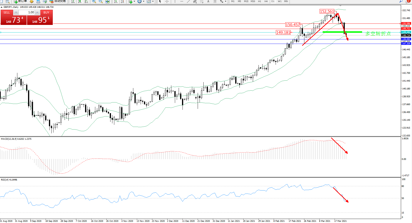 技术点评:多头动力延续布林带指标通道中上轨区间持续震荡上移,高位抵达152.561位置节点后遇阻回撤,处于中下轨区间持续震荡向下移动后触及下轨附近徘徊,布林带指标呈收口平移走势中,MACD指标处于多头区域维持整理缓慢下移,RSI指标高位持续下破50均衡线进入空头区域不断向下移动;