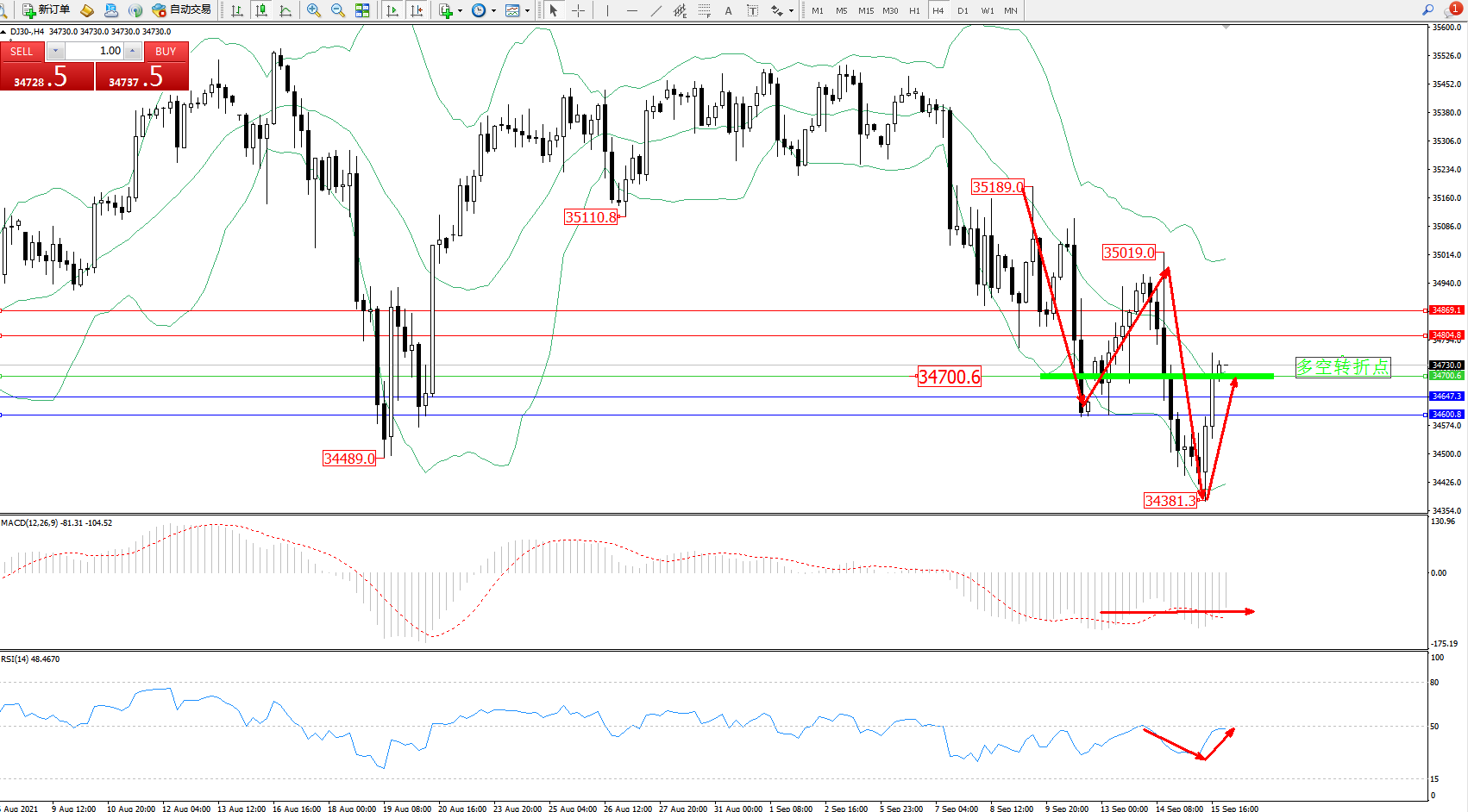 交易策略:34700上方看涨,目标34804、34869