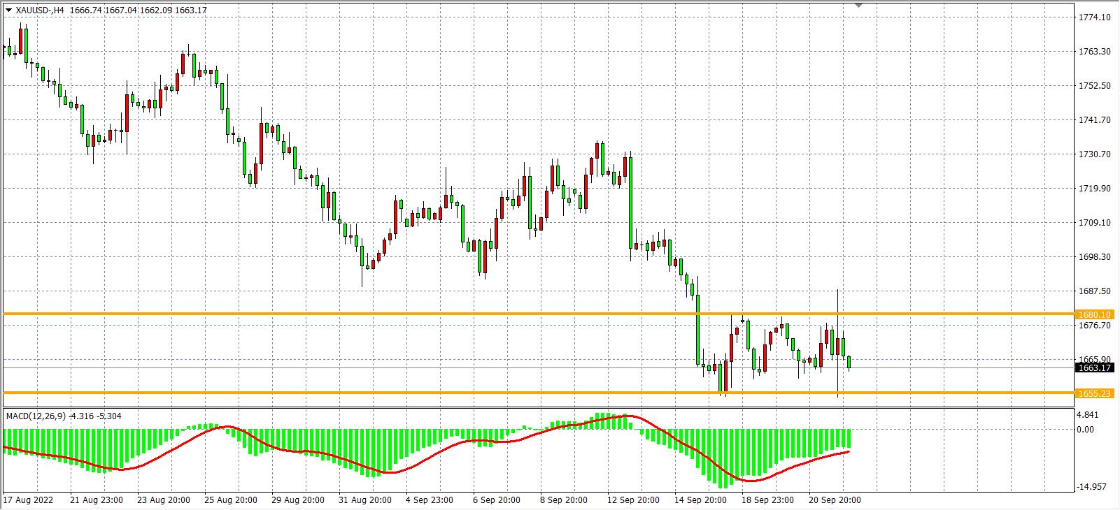 4小时图看,金价反弹一度刺穿1680,随后再度回落至该位置下,MACD于零轴之下放量缩小,显示目前走势再度进入焦灼,形成1655-1680的箱体区间整理,该箱体未破前以震荡操作看待,高空低多为主