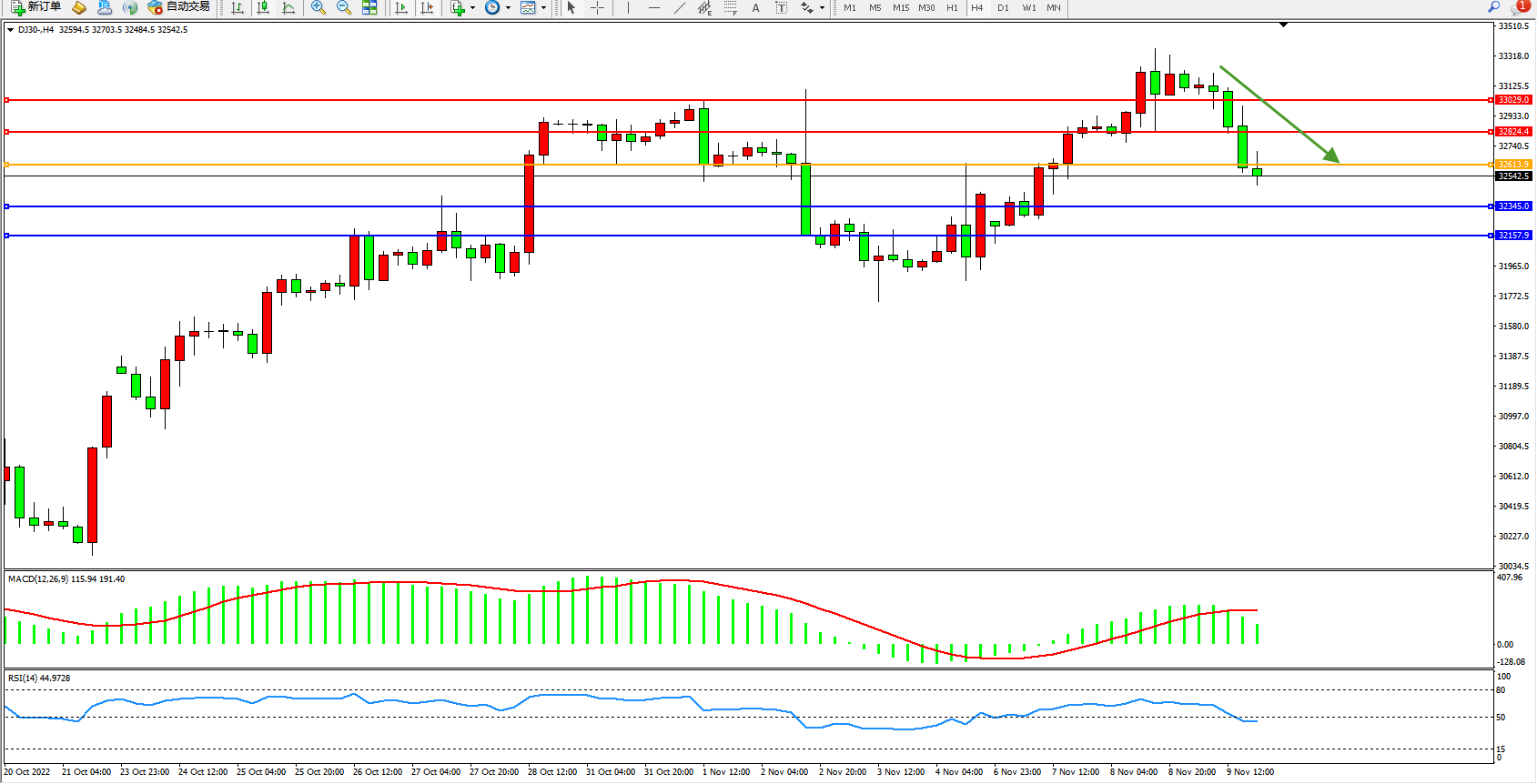 道琼斯指数11月9日(周三)收盘下跌646.56点,跌幅1.95%,报32514.27点;市场关注焦点是即将在今日周四(11月10日)公布的美国消费者物价指数报告。市场预计,美国12月份核心消费者价格指数月率和年率将分别放缓至0.5%和6.5%。