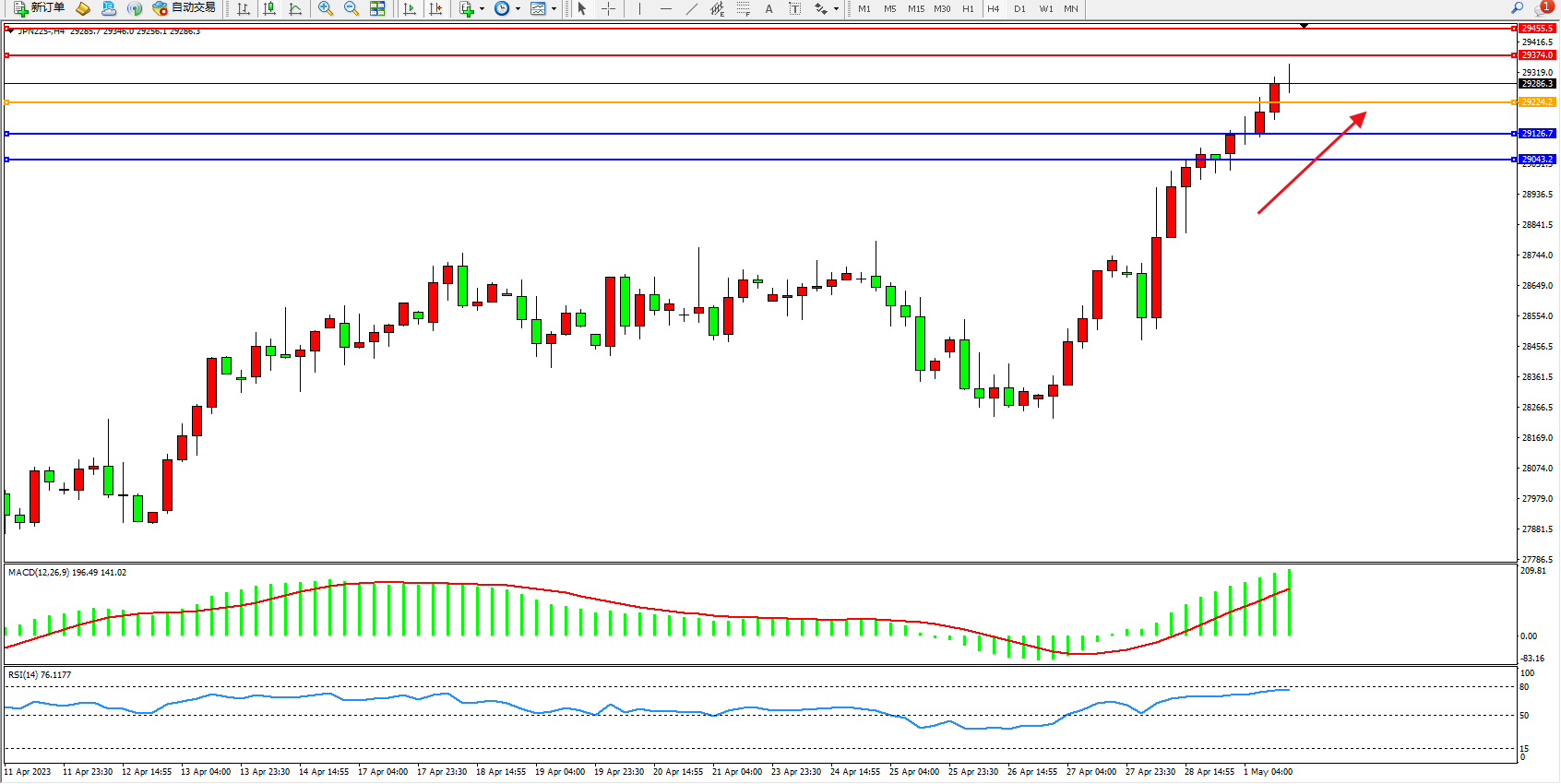4小时图看:高位多头动力持续震荡上扬,短期看涨情绪依旧,市场多头动力不断拉升中,MACD指标处于多头区域持续上行,RSI指标处于多头区域高位上扬;