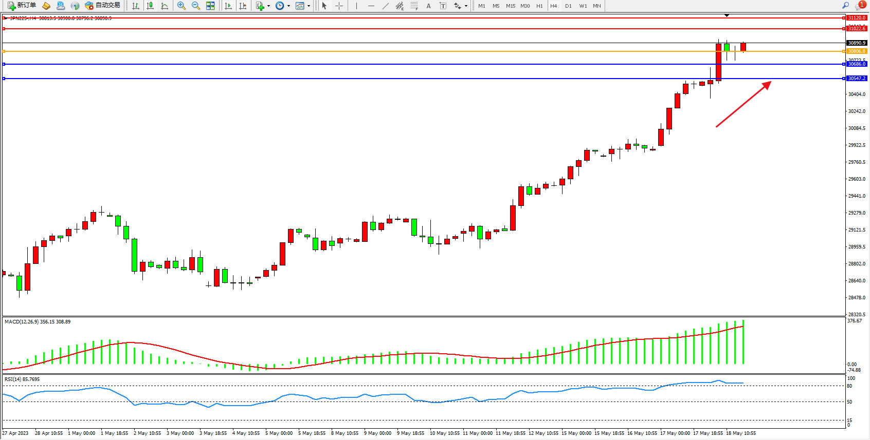 日经225指数5月18日(周四)收盘上涨497.91点,涨幅1.65%,报30591.50点。日本4月贸易逆差为4324亿日元(1美元约合137日元),同比下降近50%,这是日本连续21个月出现贸易逆差。