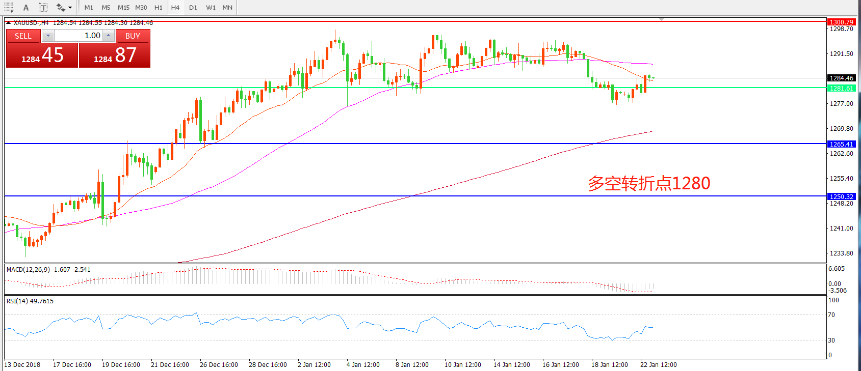 现货黄金周二(1月22日),收于1284.90美元/盎司,上涨5.37美元,涨幅0.42%。
