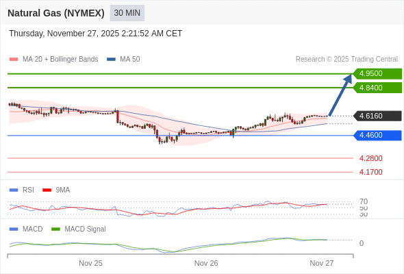 备选策略: 如跌破 4.4600 ,Natural Gas (NYMEX) (JAN6) 目标方向定在 4.2800 和 4.1700 。